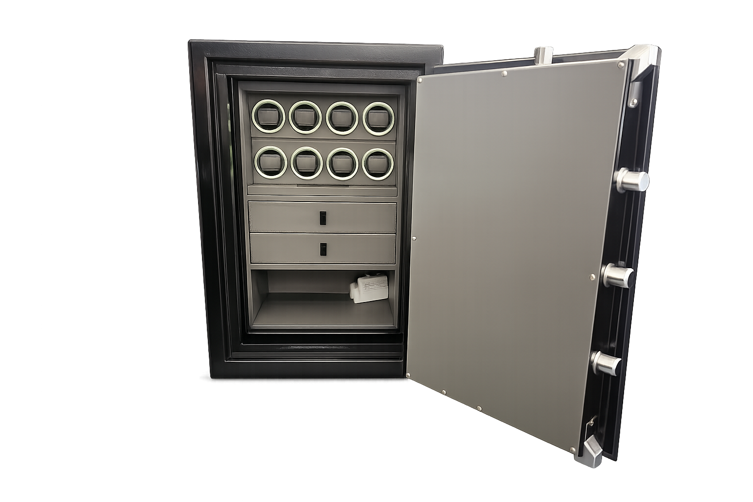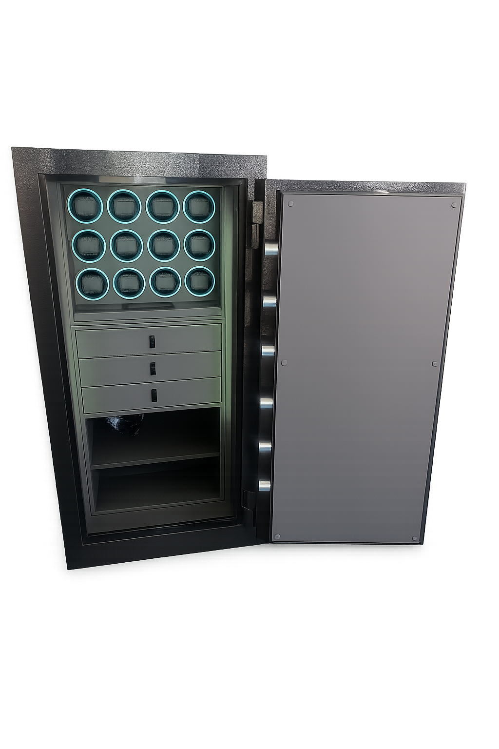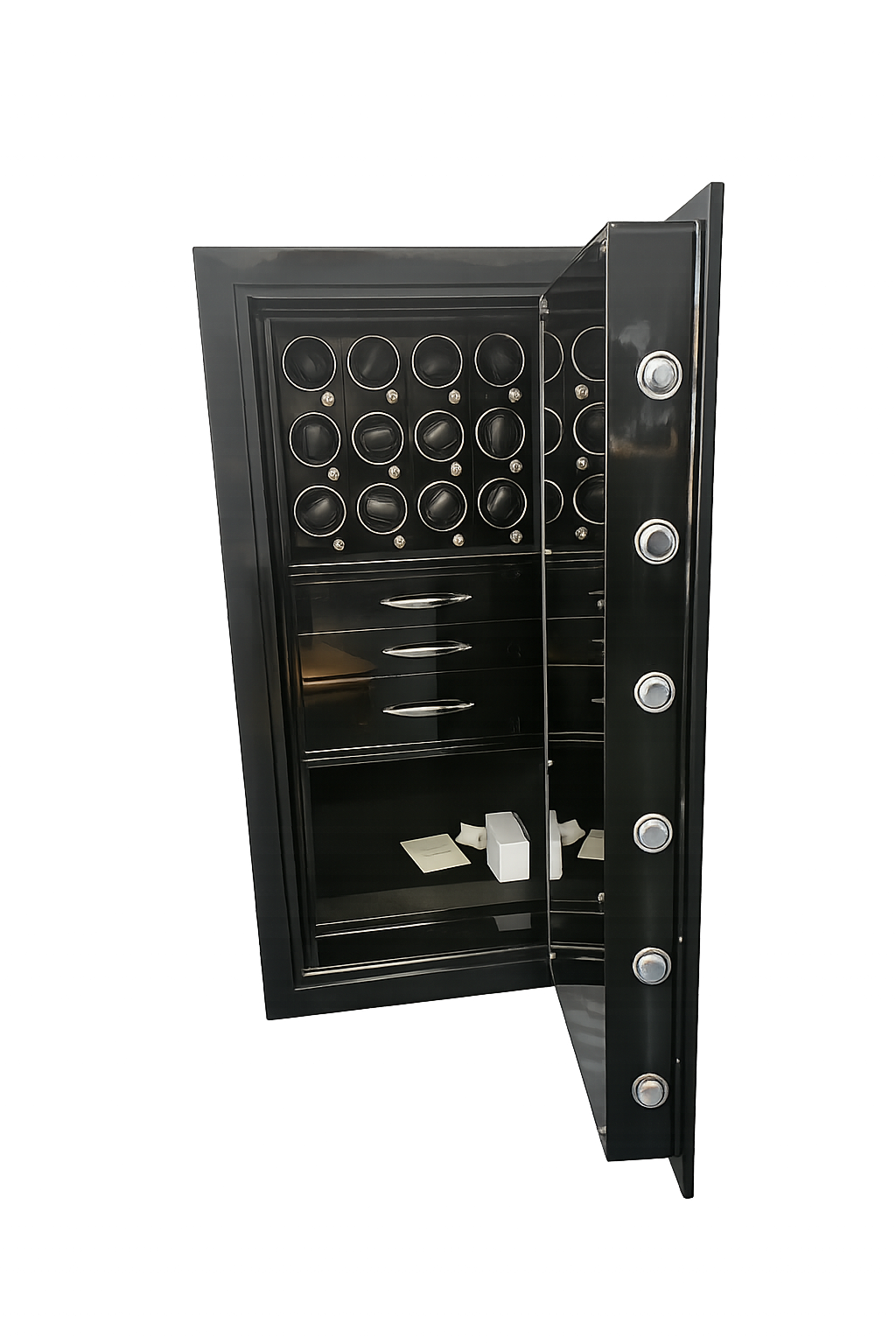 Each unit is built to order and fully customisable to your exact requirements — from the number and configuration of watch winders, drawer layouts, and jewellery compartments, through to interior finishes, LED lighting, shelving, and power integration. Whether you require a compact personal safe or a larger bespoke installation, every detail is tailored to suit your collection and lifestyle.